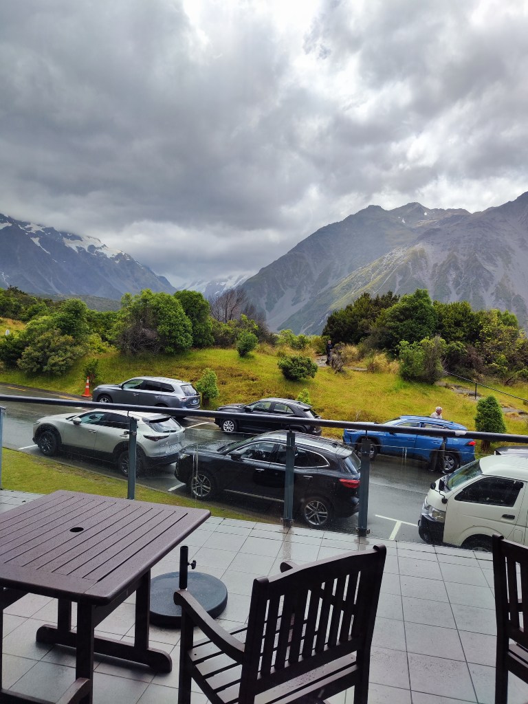 On arrival at the Hooker Valley Car park it was, errr, raining, indeed lashing it down! So having checked the good old BBC weather app, we headed for the the Sir Edmund Hilary Cafe. Which also has nice views…
