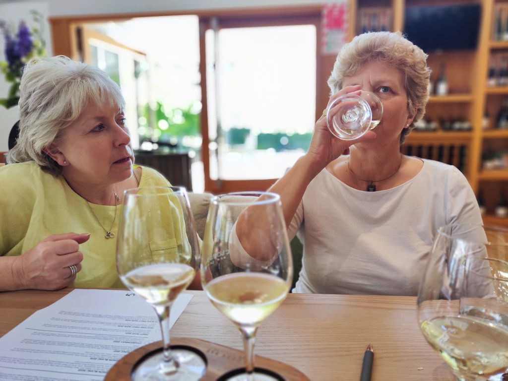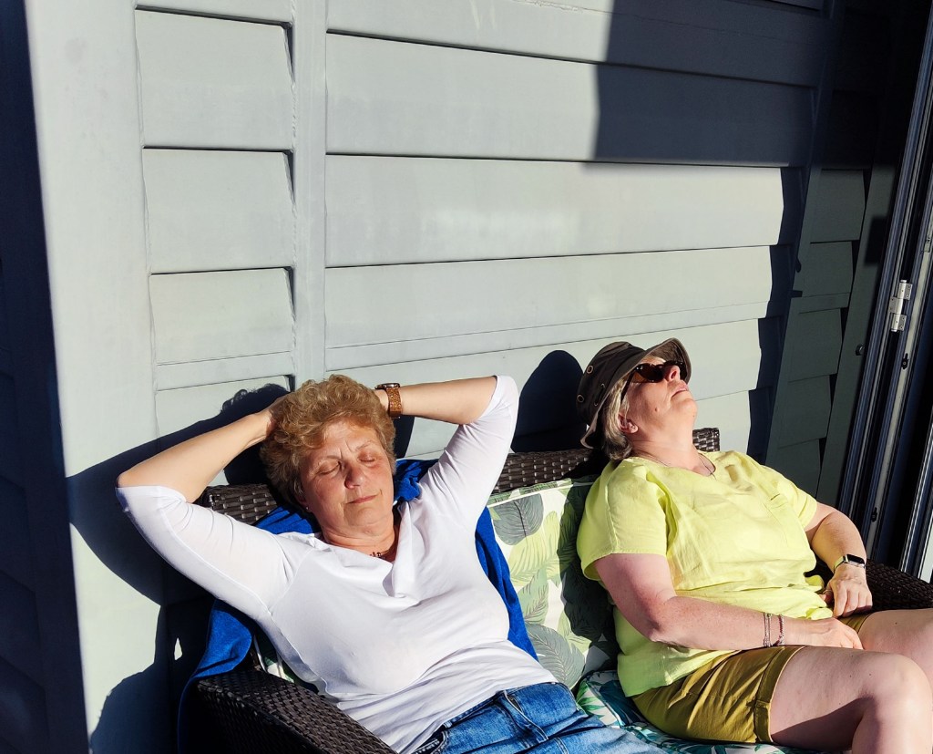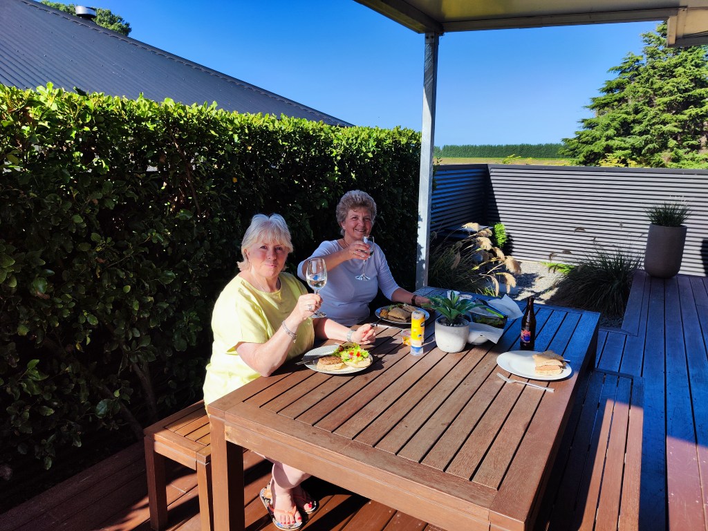 Back at base, we have tea on the patio and they sample the newly purchased wine.