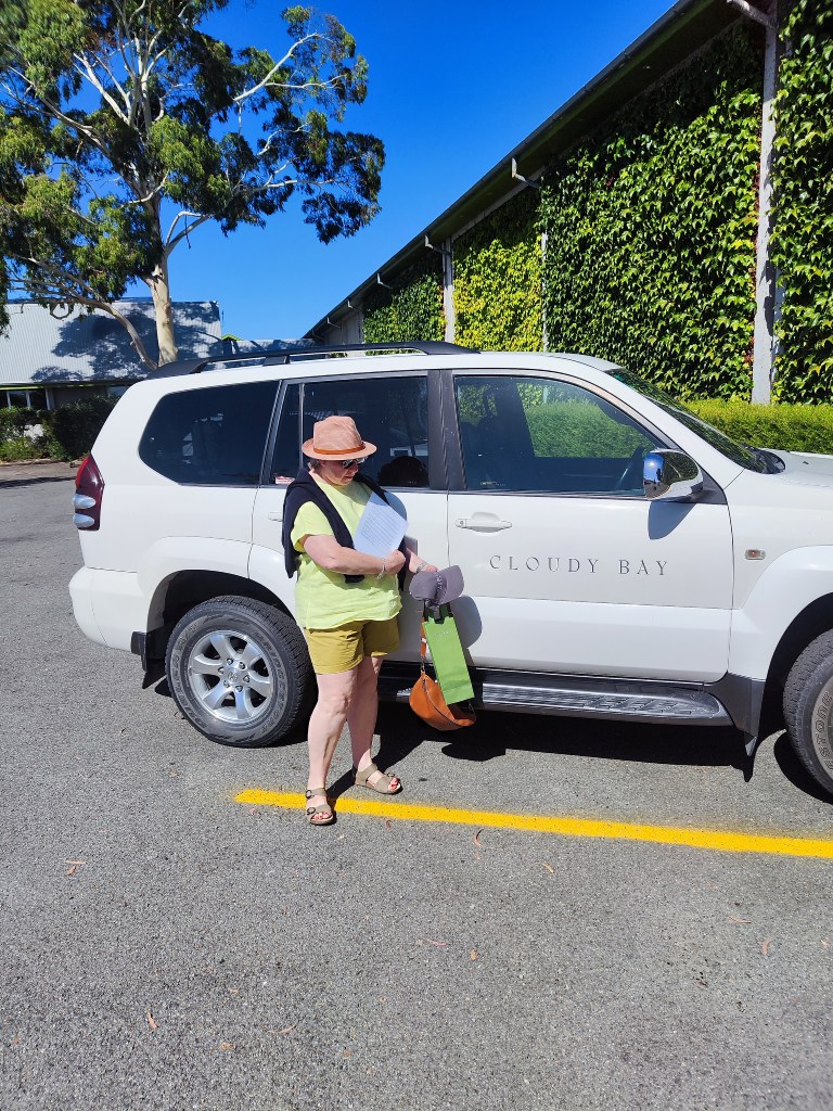 Cloudy Bay experience over, and having bought a nice bottle of wine and a new Cloudy Bay golf cap, Lynn attempts to get in to the wrong car for the journey home.