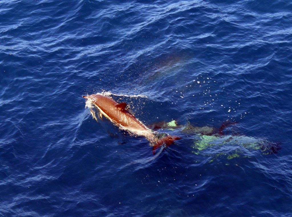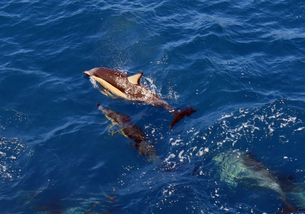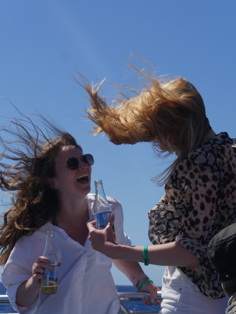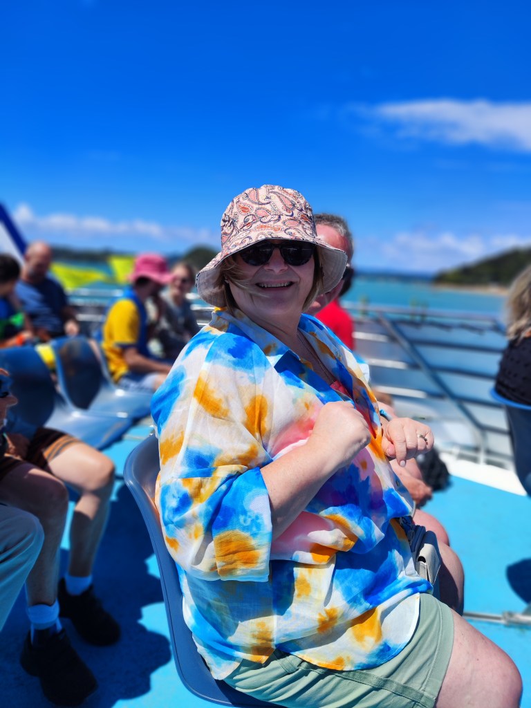 Diane has bought a new hat for the occasion..James says the captain is going to let him steer the boat later… We are worried. – Note the Japanese chap behind looking a bit green.Nice and calm.. for now. But is soon gets breezy and a bit choppy..Not that Zoe and Kate are bothered by that!