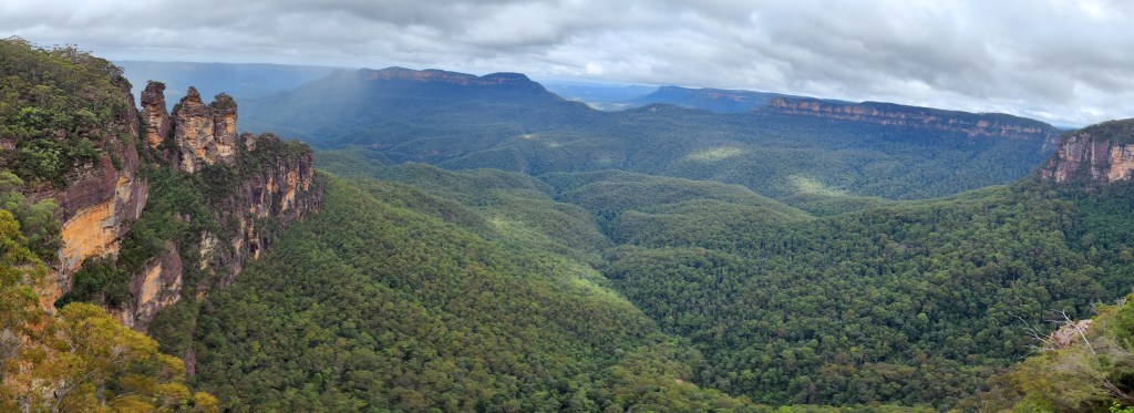 Now we have had some mixed reviews from people about the Blue Mountains. Some telling us they are a must and amazing. Others saying it’s OK but nothing to write home about. Well for us, it was the first. The scale is breath taking. I think it’s one of those things. When you think of mountains, you think of being at the bottom and looking up at snowy peaks that you might climb. Well, it’s not that kind of mountain. For starters you are already on top. Your view is looking down on to a vast rainforest. And just for the record, it’s not raining! Serious bonus for us. Here’s some photos that just don’t do justice to the scale of it.